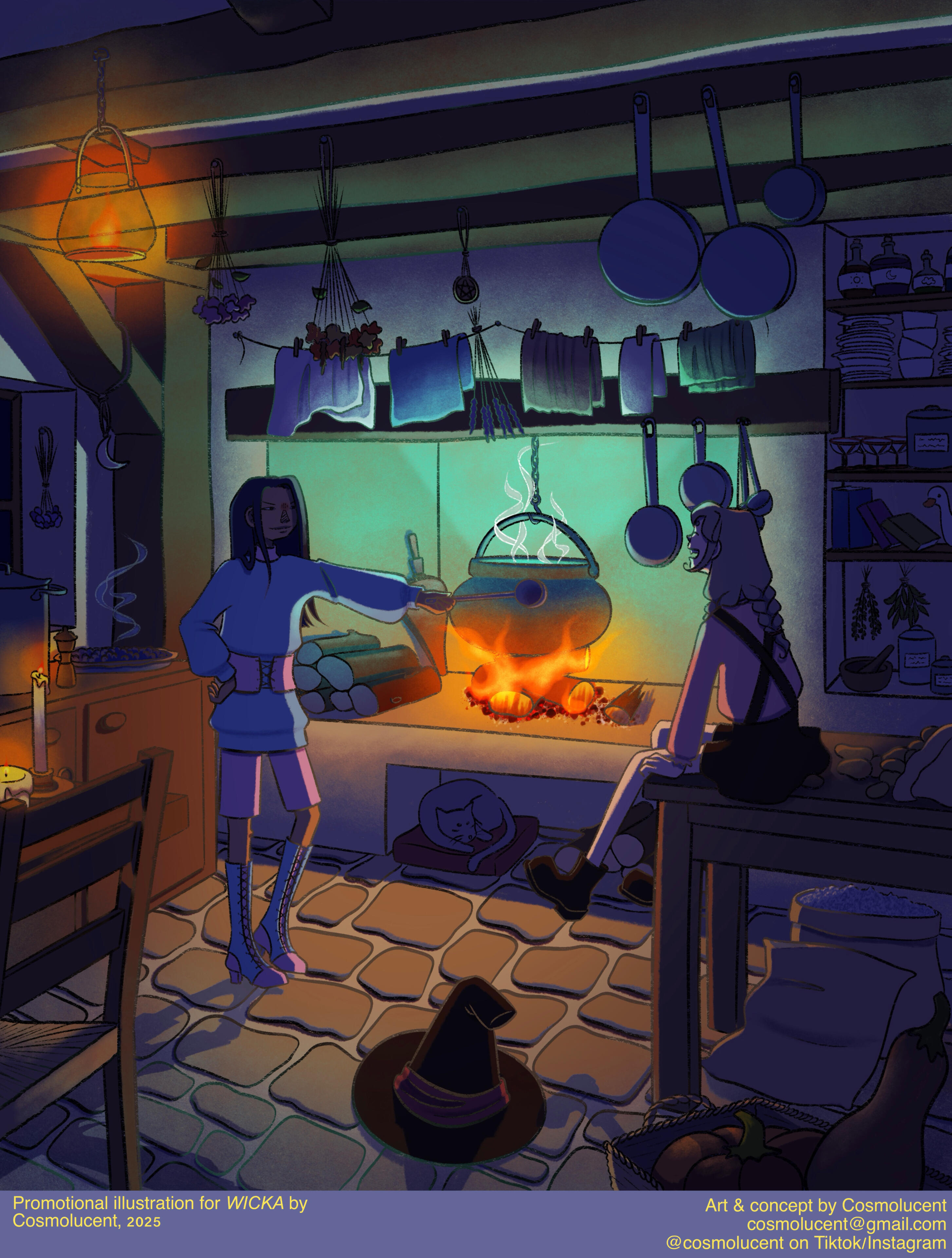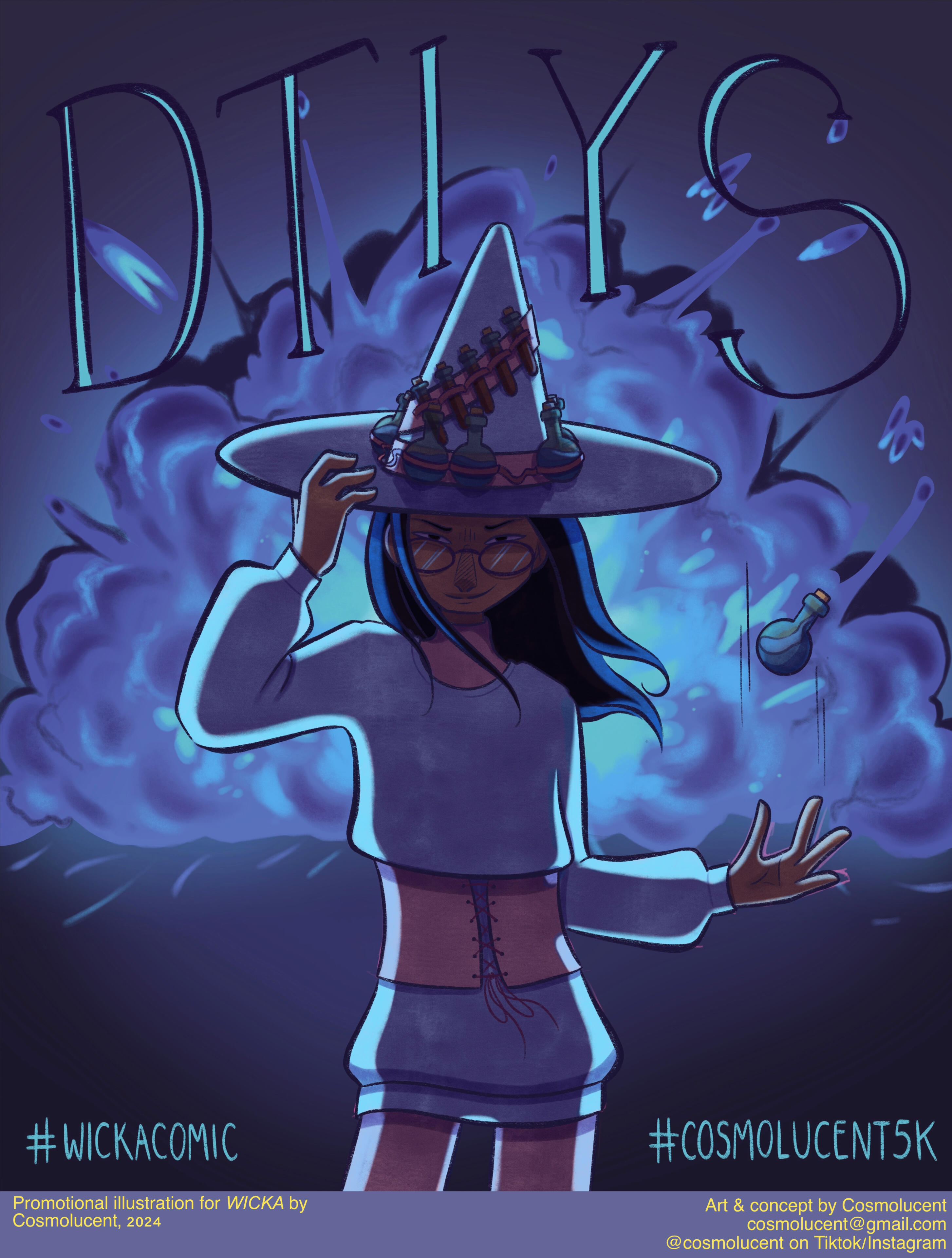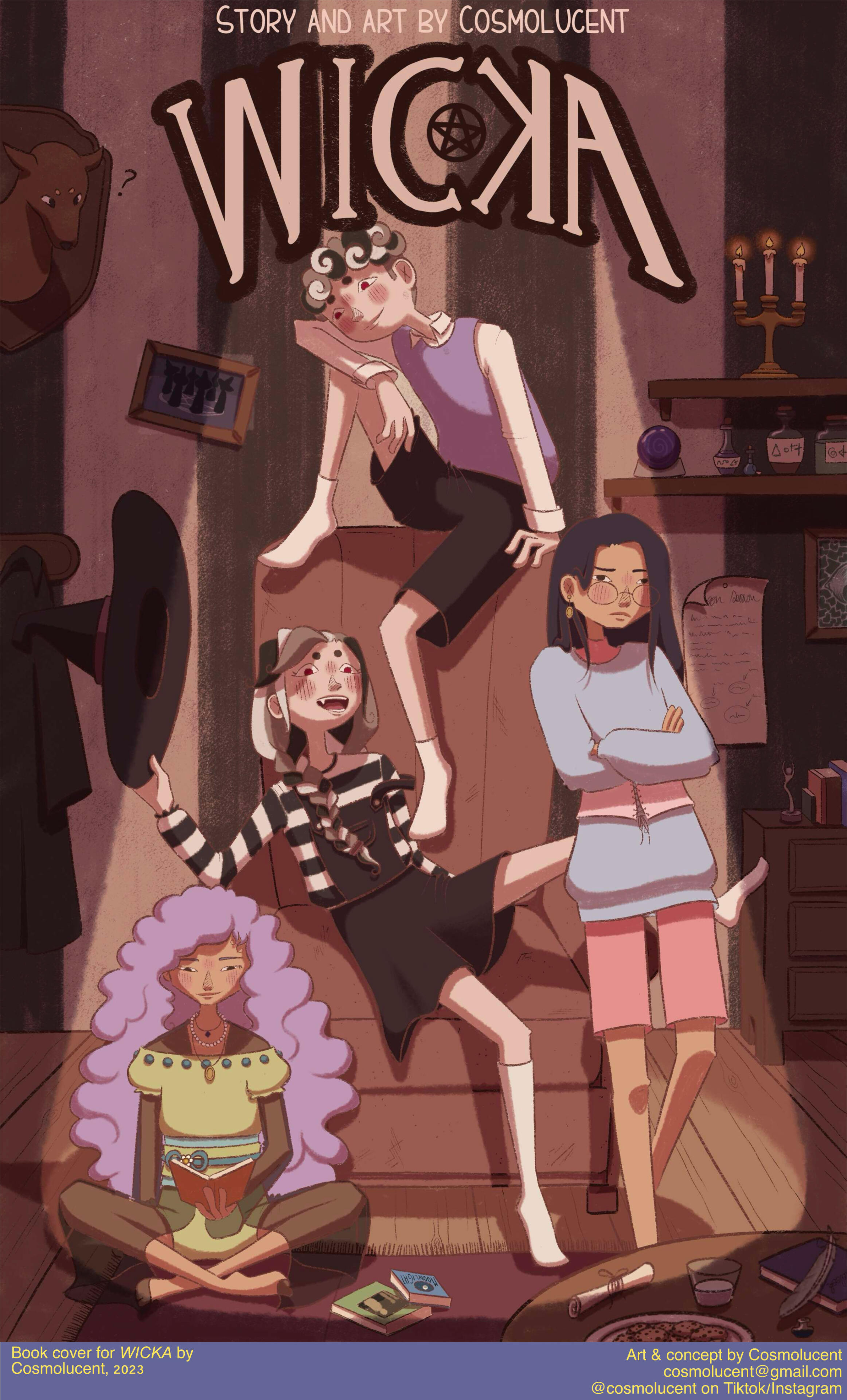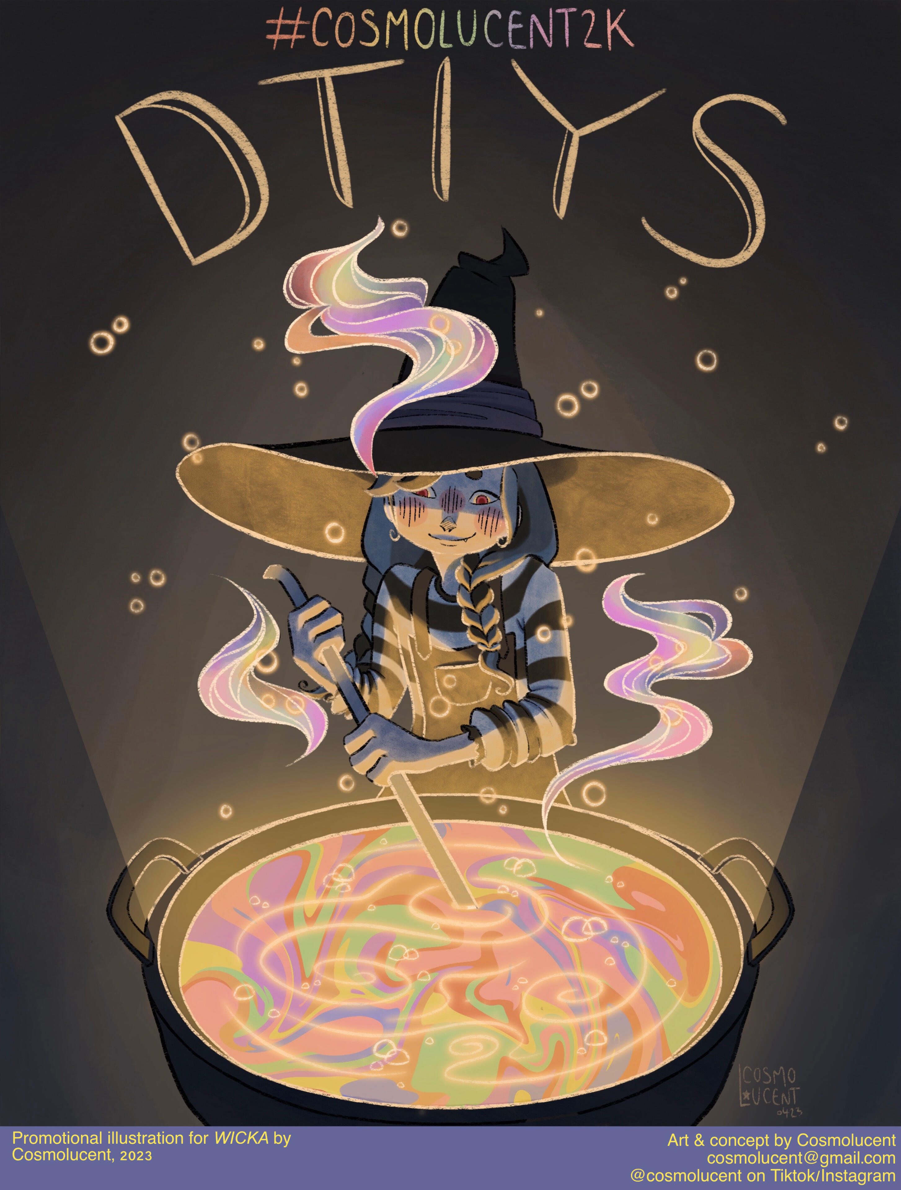 Cosmo is a french illustrator and visual artist. Through both digital and traditional mediums, they depict an enchanting world of fantasy and coming-of-age tales in a soft and colorful approach. Their cartoony style, coupled with their affection for detail and deep symbolism allows them to tell stories captivating both younger and older audience.Growing up in the South of France, they discovered their passion for art early on and they have been studying visual expression for almost 15 years. Despite being the pupil of Lucy Mazel for a while in 2017, they are mainly self-taught. They have since then worked on various indie projects and commissions. They were a chara-designer and animator for the game Glorybound (unreleased) in its beginning, as well an artistic director for several local french associations. Their most known works online are their redesigns of LGBT+ flags and their Everyday Witches series of digital watercolors.They have also been working on their own witchy comic WICKA for over 7 years and they plan to release it in a couple years.