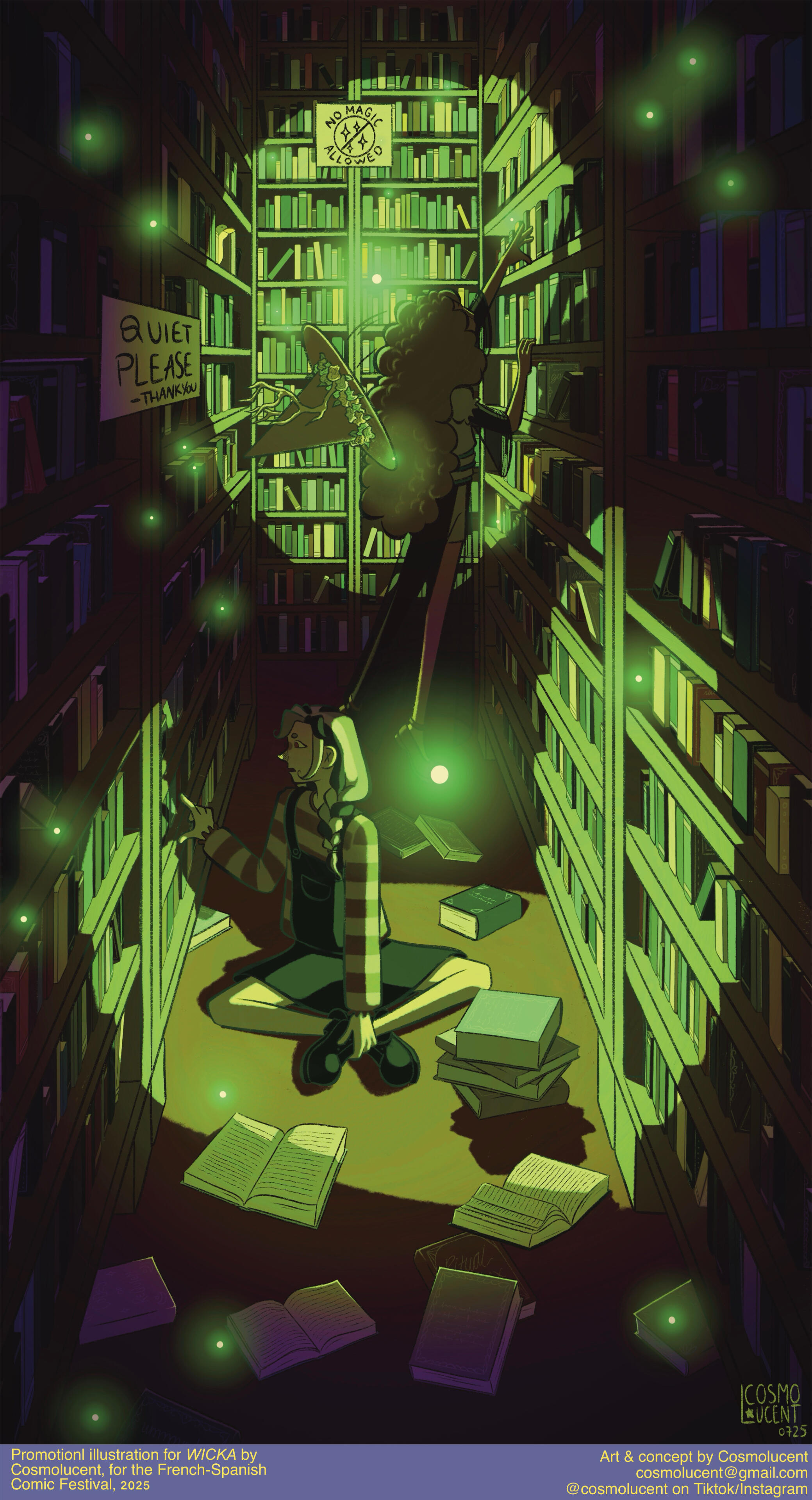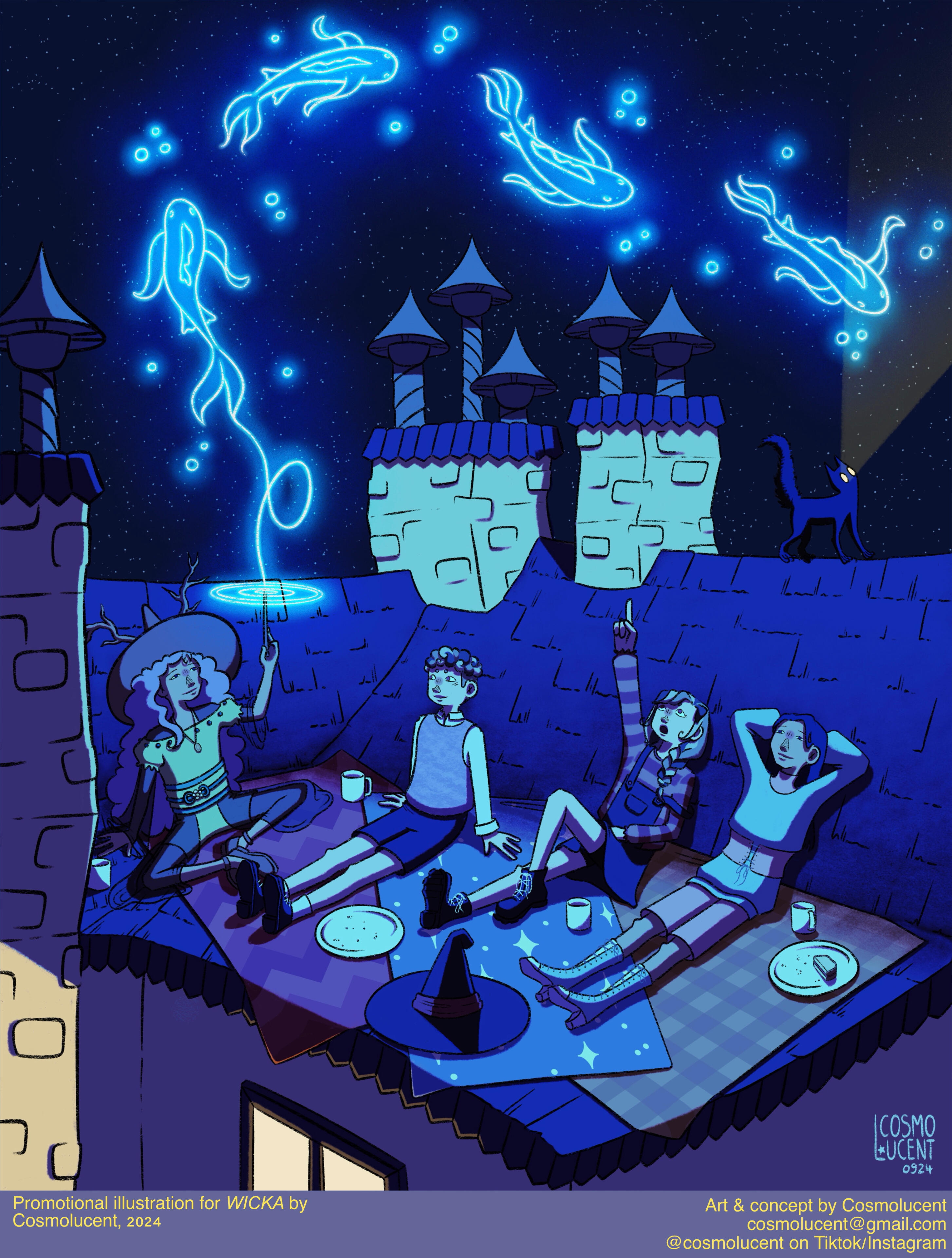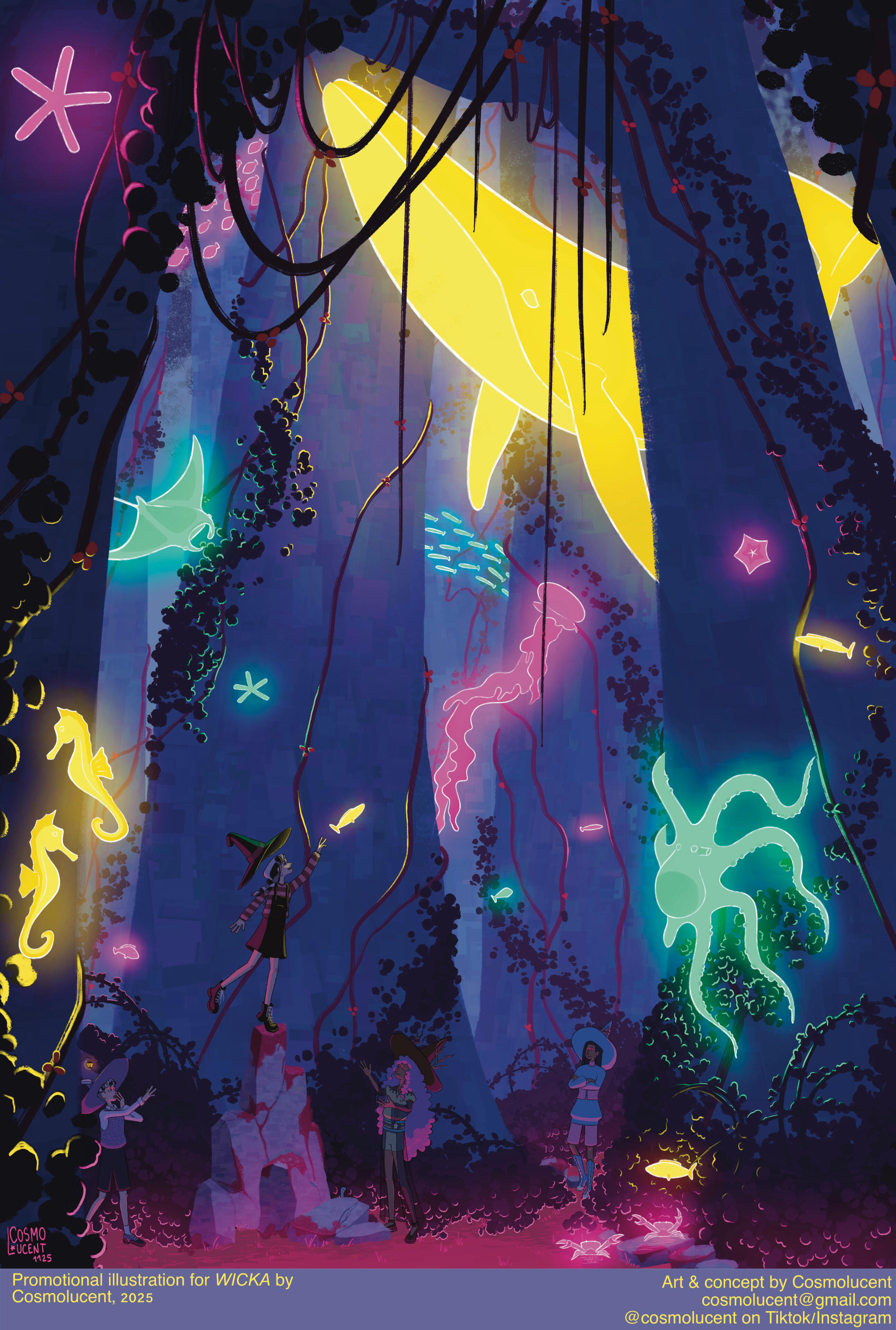 Cosmo is a french illustrator and visual artist. Through both digital and traditional mediums, they depict an enchanting world of fantasy and coming-of-age tales in a soft and colorful approach. Their cartoony style, coupled with their affection for detail and deep symbolism allows them to tell stories captivating both younger and older audience.Growing up in the South of France, they discovered their passion for art early on and they have been studying visual expression for almost 15 years. Despite being the pupil of Lucy Mazel for a while in 2017, they are mainly self-taught. They have since then worked on various indie projects and commissions. They were a chara-designer and animator for the game Glorybound (unreleased) in its beginning, as well an artistic director for several local french associations. Their most known works online are their redesigns of LGBT+ flags and their Everyday Witches series of digital watercolors.They have also been working on their own witchy comic WICKA for over 7 years and they plan to release it in a couple years.